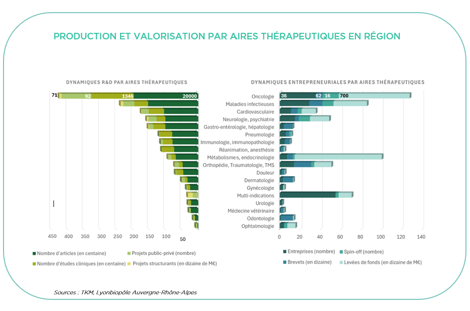 Sans surprise, les aires thérapeutiques « oncologie » et « maladies infectieuses » sont les plus dynamiques, à la fois en termes de R&D et d’entreprenariat.