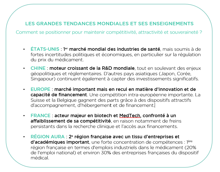Pour remettre en perspective la situation, l’équipe de Lyonbiopôle a présenté les grandes tendances mondiales, européennes, nationales et régionales de l’innovation en santé, ainsi que les principaux enseignements et questions qui en découlent.
