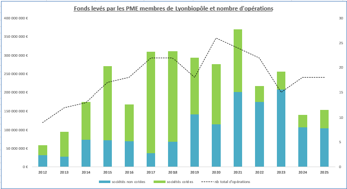 Cette dynamique a des conséquences directes sur les start-ups et PME en phase d’amorçage ou de développement précoce, qui constituent une grande part des structures accompagnées par Lyonbiopôle en Auvergne-Rhône-Alpes. Selon les éléments recueillis auprès de nos membres, en région, après des années de croissance soutenue culminant en 2021, le montant global des levées de fonds réalisées par les membres du pôle s’est contracté de manière significative.