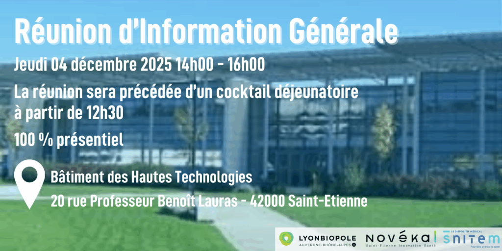 Novéka! a le plaisir de vous convier, en partenariat avec Lyonbiopôle, à la réunion d’information générale organisée par le SNITEM le jeudi 4 décembre 2025, de 14h00 à 16h00, à Saint-Étienne.