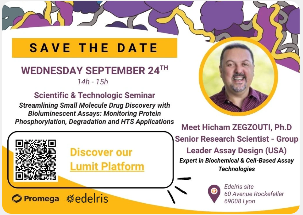 Please confirm your attendance by sending an email to reception@edelris.com, including your name, title, and affiliation, with the subject line “Promega seminar”.